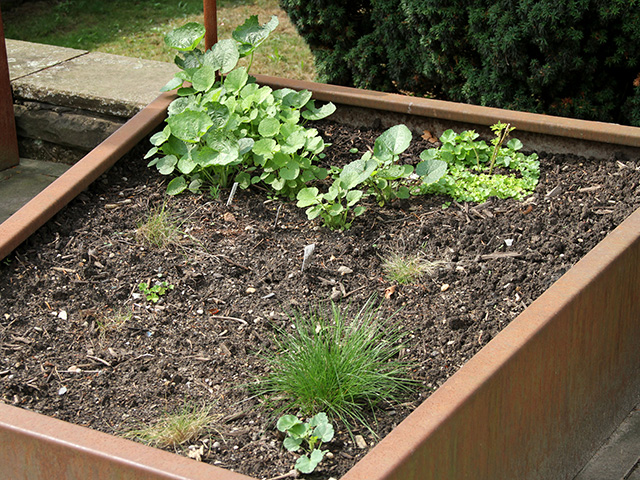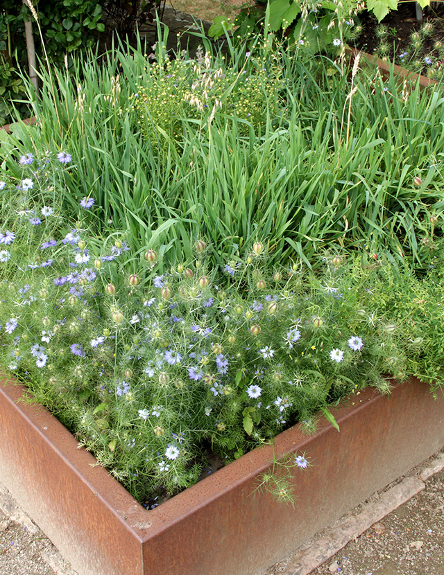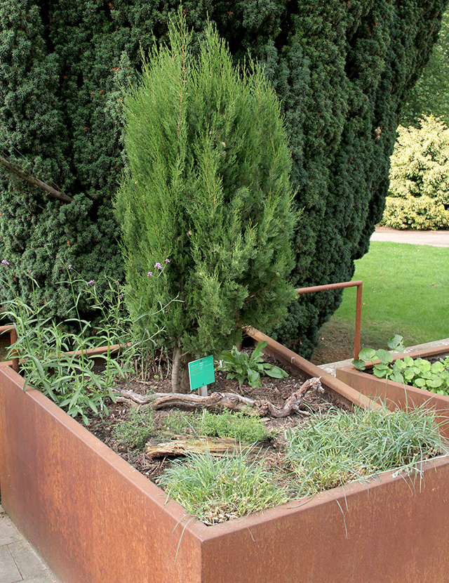 Dieses Beet wird von der Zypresse beherrscht, in ihrem Schatten wachsen Färberkamille, Färberwaid und Färbermeister, mit denen Stoffe gelb, blau und rot gefärbt wurden.