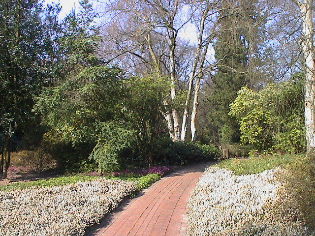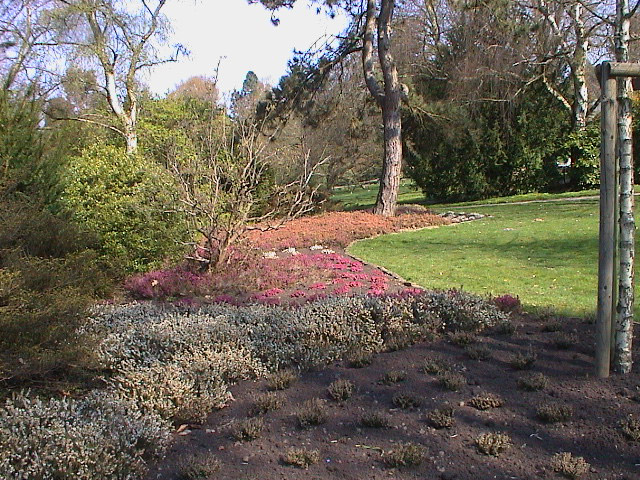 An einem Hang liegend beheimatet er neben den typischen Heidekräutern zahlreiche Mitglieder der Familie Ericaceae. Sie blühen oft, wenn sogar noch Schnee fällt, wie es im Namen Schnee-Heide (Erica herbacea) zum Ausdruck kommt. So bringt die früh blühende Heide die ersten Farbtupfer in den Garten. Schon bald zeigen die zahlreichen prachtvollen Pieris japonica-Sträucher ihre Glöckchenpracht. Und die Prachtglocke (Enkianthus) schließt sich an.