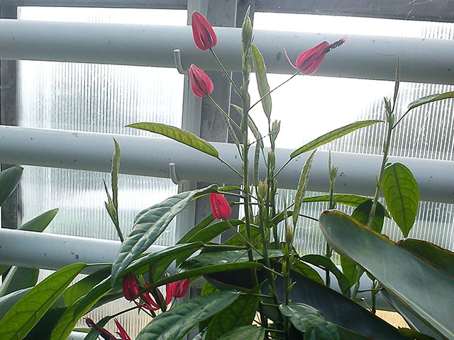 - Tetrastigma voinierianum – Kastanienwein, Vitaceae – Weinrebengewächse, kastanienähnliche Blätter, Griffel endet in vierteiligen Narbe, auch Blüten sind vierzählig, Blüten meist eingeschlechtig, kommt in Asien und Ozeanien vor, rankt an der Nordost-Wand